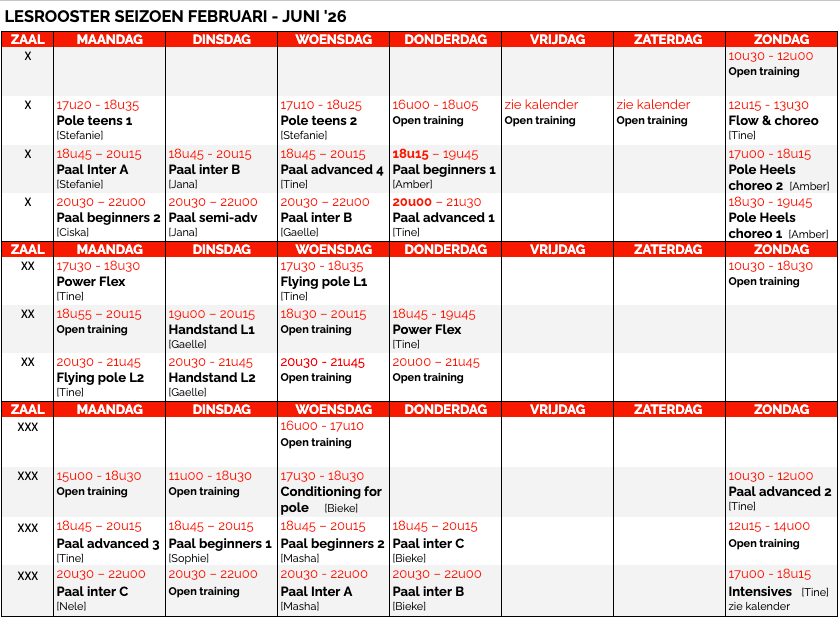 Hieronder vind je het lesrooster voor onze lessen in Gent.
